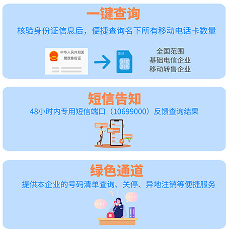 9月14日,工业和信息化部组织正式开通了全国移动电话卡“一证通查”便民服务,群众凭借居民身份证便可查询其名下在每家基础电信企业、移动通信转售企业所办理的手机卡数量。